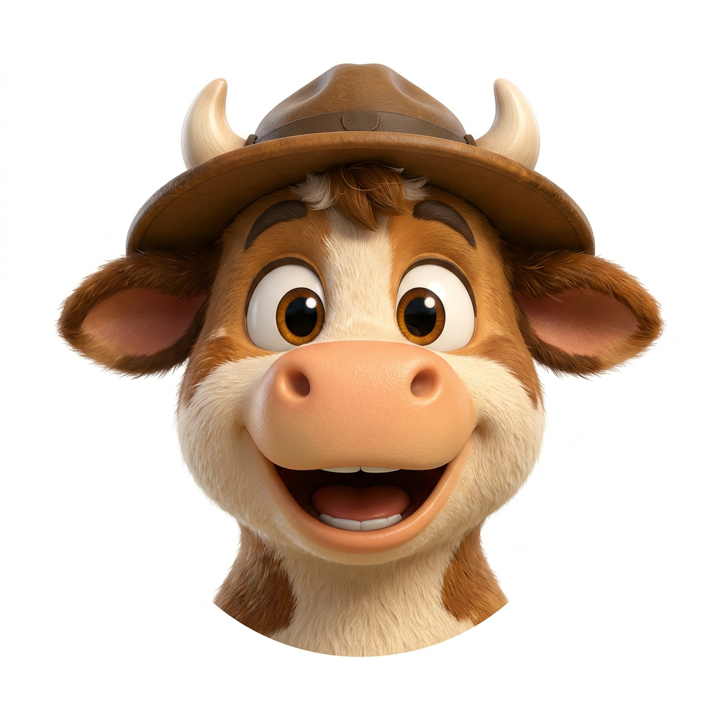 Silly Cow is a brown-and-cream calf with a safari hat, a worn leather satchel, and boots that are always one size too big. He's clumsy, kind, endlessly curious — and absolutely convinced the world is full of wonders worth wobbling toward.